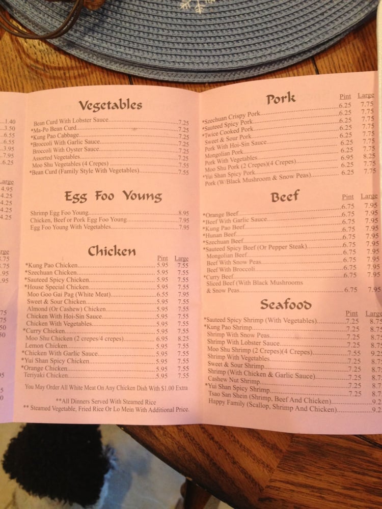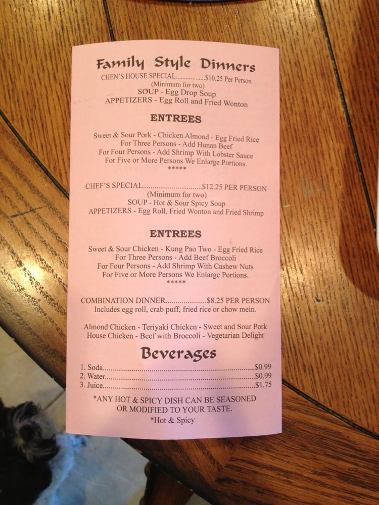 Soup - hot & sour spicy soup. Appetizers - egg roll, crab puffs and fried shrimp. Entrées - sweet & sour chicken - kung pao two - egg fried rice. For three persons - add beef broccoli. For four persons - add shrimp with cashew nuts. For five or more persons, we enlarge portions.