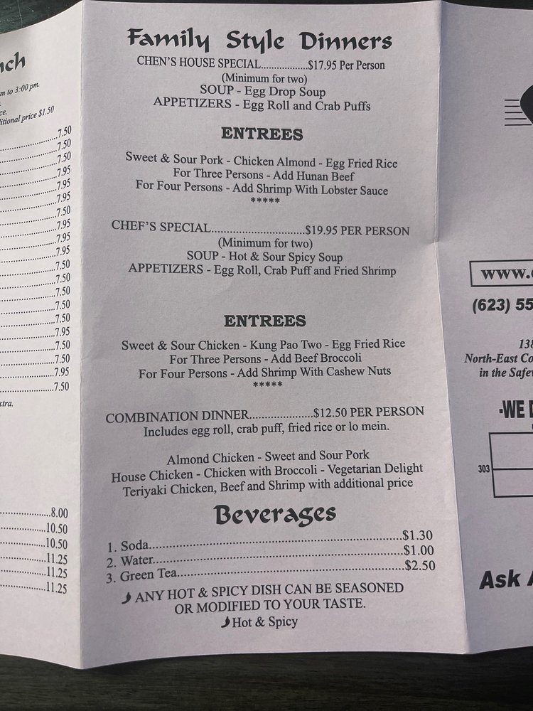Chen Wok, a popular Chinese restaurant in Surprise, AZ, offers a delightful range of Chinese, soup, and seafood dishes. With a focus on customer satisfaction, Chen Wok provides delivery, takeout, and reservation options. The restaurant is known for its generous portions and flavorful dishes, such as the Spicy Orange Chicken and Lo Mein. Customers also praise the impeccable cleanliness, friendly staff, and efficient service at Chen Wok. The menu includes options for all, including kids and groups, and features Asian-owned, casual, and classy vibes with wheelchair accessibility and free Wi-Fi. Whether you're dining in or taking out, Chen Wok guarantees a memorable and satisfying culinary experience.