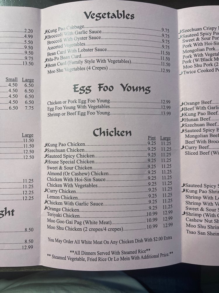 Tender chicken paired with crisp vegetables. Choose from a variety of sides: fried rice, lo mein combinations, or vegetable, chicken, pork, shrimp, beef, and house specialties.