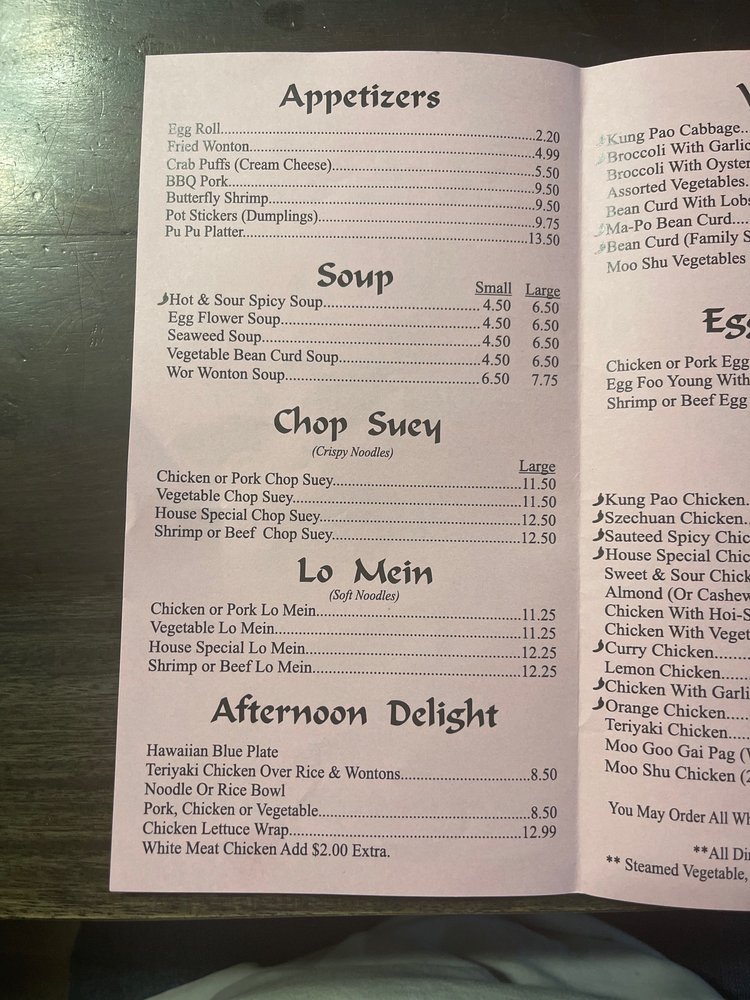 Wor Wonton Soup: Pork-filled wontons, shrimp, chicken and select vegetables in a chicken broth. Options: small, large.